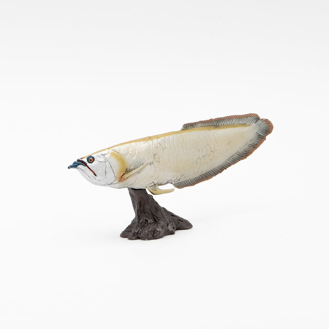 熱帯魚ショップでも多く見かけることができ、その優雅なシルエットは観賞魚としても人気のあるなじみ深い魚です。シリーズの中では比較的新しくでてきた古代魚で、一般的な魚に近い形をしていますが、その中で古代魚の特徴を見る事ができます。1mクラスに育った貫禄ある老成個体をモチーフに製作され、ウロコやヒレの形状、体型など細かなディテールまでも表現し、造型、彩色共に本格的なシルバーアロワナのフィギュアに仕上がっています。悠々と前方へ泳いでいくようなイメージが感じられ、動きにも注目したいモデルです。