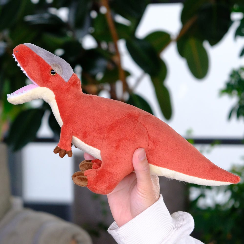 可愛くデフォルメされたフォルムの中に、巨大な頭部や細長いシルエットなどの特徴が、ぎゅっとつめこまれたギガノトサウルスのぬいぐるみです。2足で自立が可能なので、遊んだり飾ったり楽しみ方が広がります。