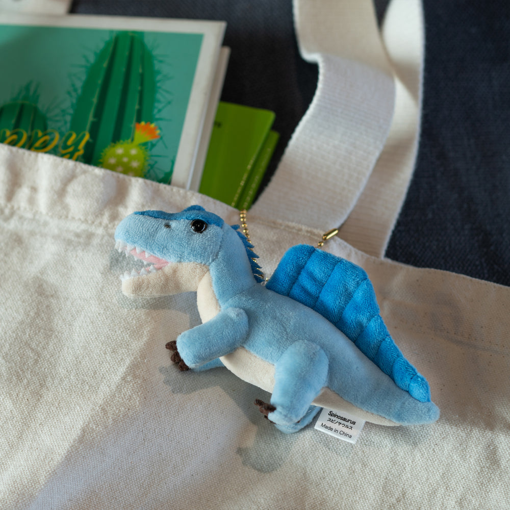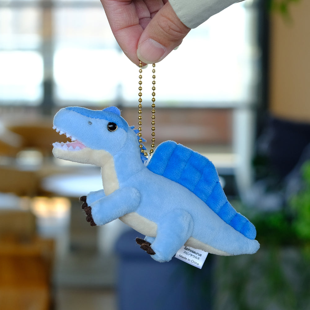 背中の帆や細長い頭部などの特徴をぎゅっとつめこんだスピノサウルスのボールチェーン付きミニマスコットです。バッグやリュックにつけて一緒にお出かけが楽しめます。