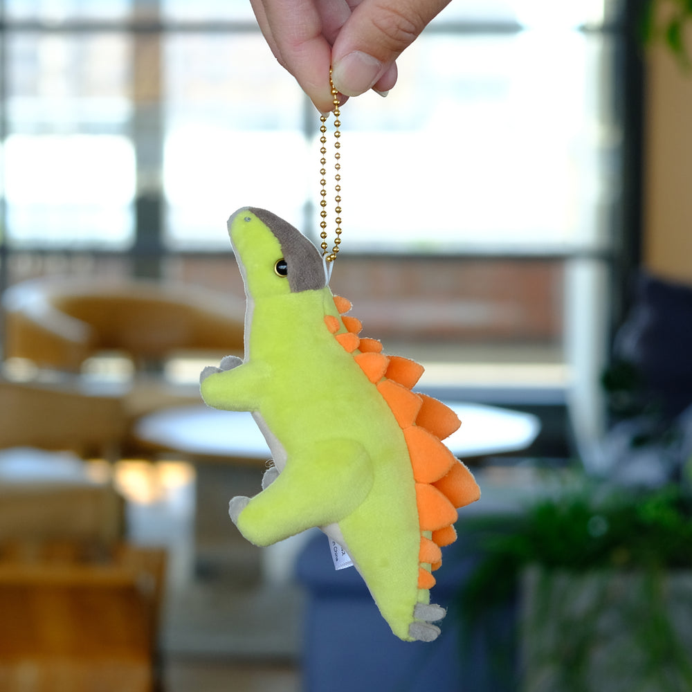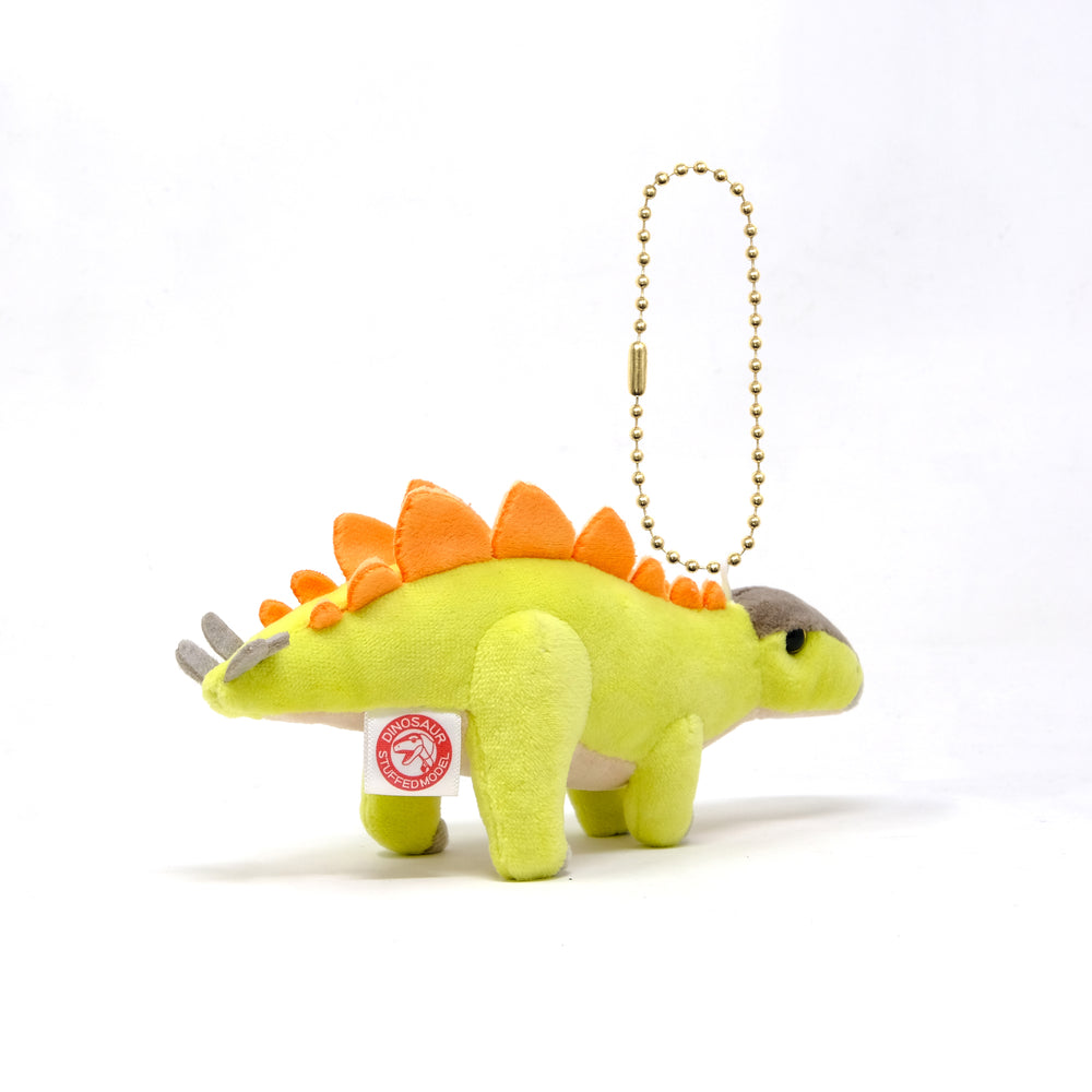 背中に並ぶプレートや尻尾の先のトゲなどの特徴をぎゅっとつめこんだステゴサウルスのボールチェーン付きミニマスコットです。バッグやリュックにつけて一緒にお出かけが楽しめます。